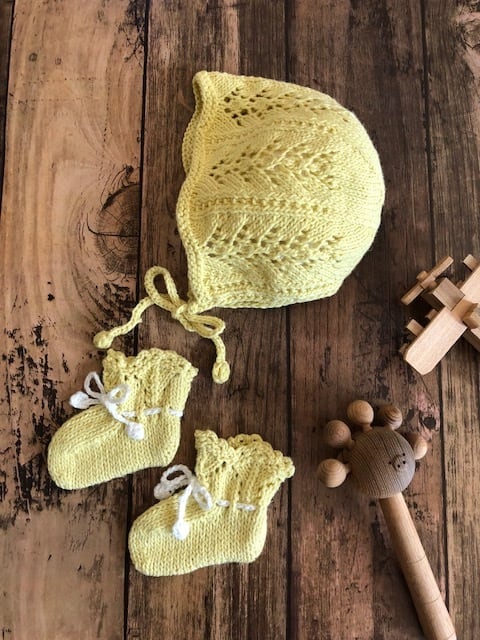 赤ちゃん用のボンネットとソックスを、お揃いで編みました。